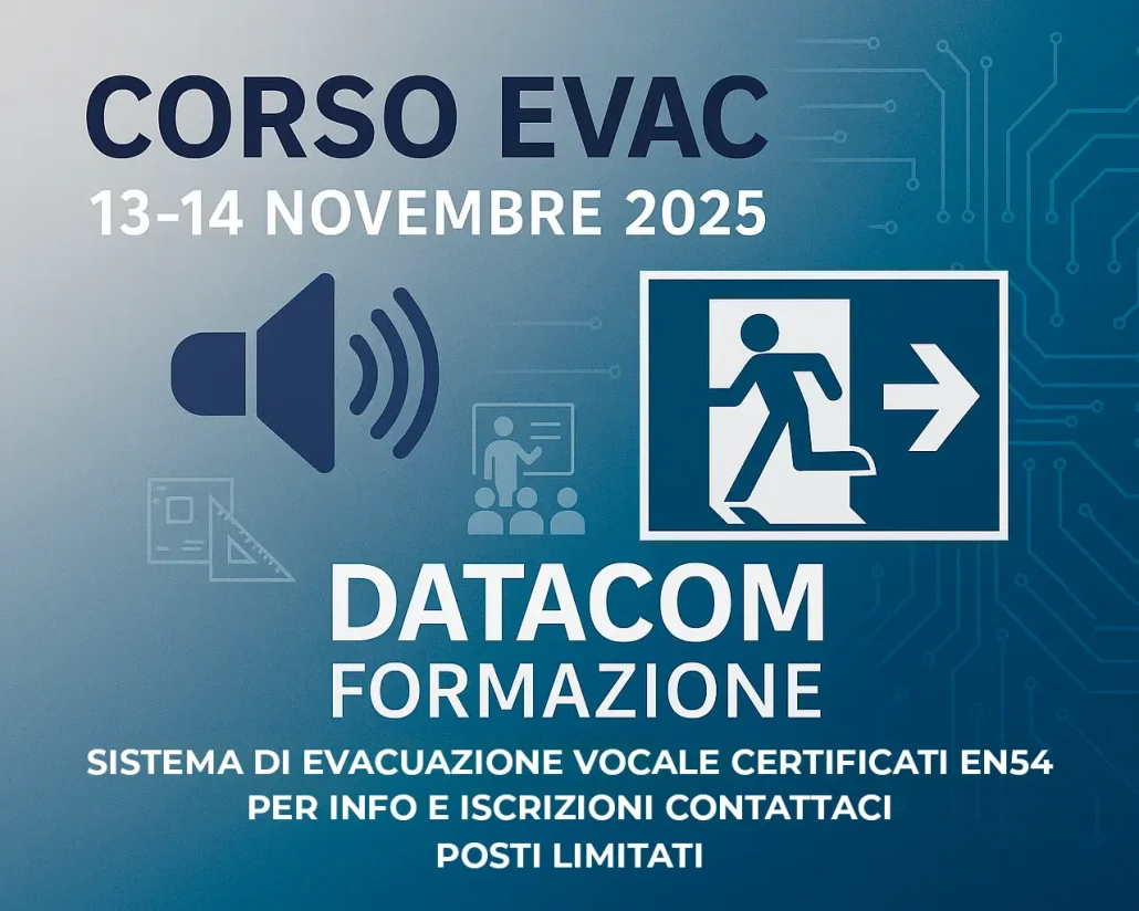 Per questo Datacom Formazione organizza il Corso EVAC, dedicato ai professionisti che vogliono approfondire la progettazione, l’installazione e la manutenzione dei sistemi di evacuazione vocale certificati EN54.
