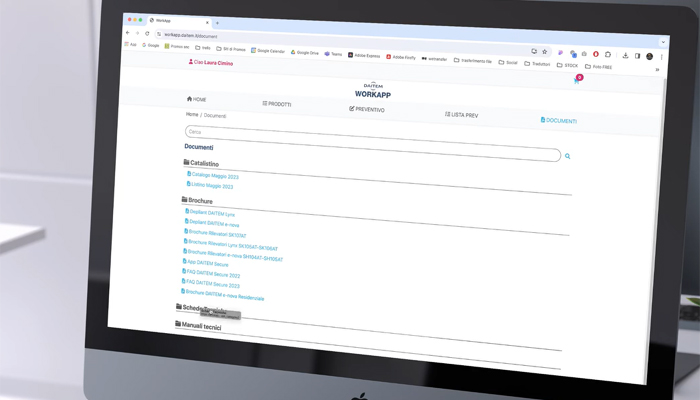 Centralizzazione di tutti i materiali necessari DAITEM WorkApp offre un’innovativa funzionalità: la centralizzazione di tutti i materiali necessari per il tuo lavoro. Con un’unica area di archiviazione, avrai accesso immediato a schede tecniche, cataloghi, brochure e manuali. Questa caratteristica ti consente di avere sotto controllo ogni dettaglio, migliorando l’organizzazione e aumentando l’efficienza del tuo lavoro.